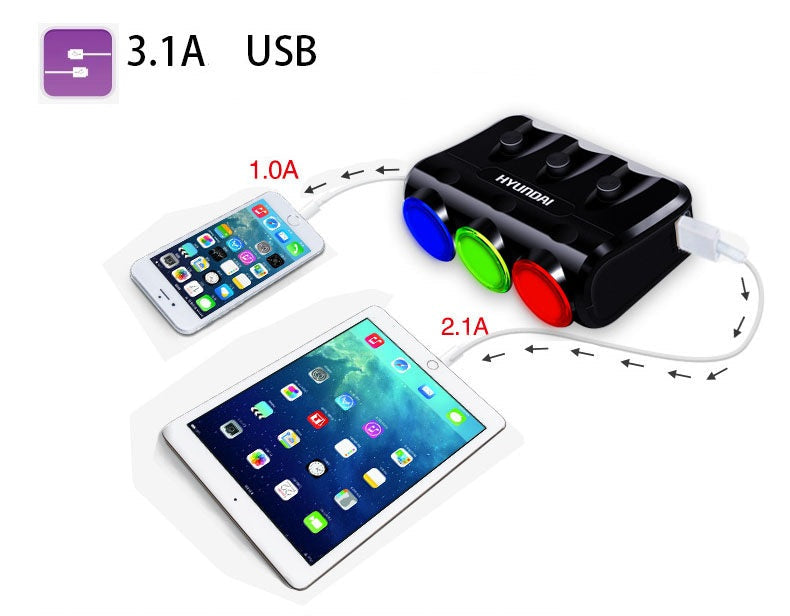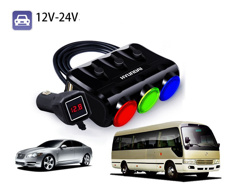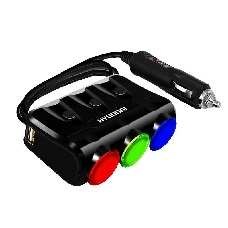 3 encendedores enchufes, 2 puertos USB, muy práctico y fácil de usar.